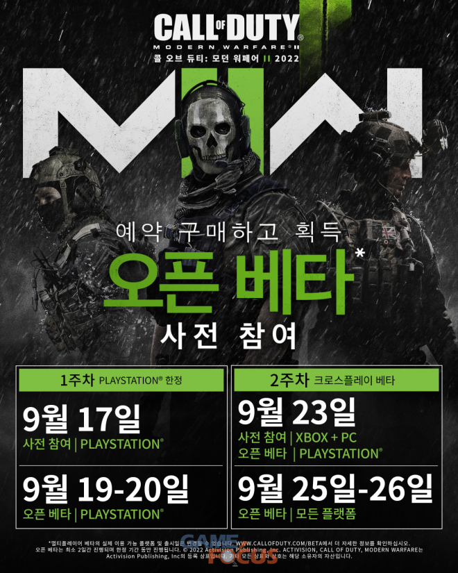 PlayStation 4 또는 PlayStation 5에서 게임을 예약 주문했거나 베타 코드를 받은 플레이어들은 9월 17일 모던 워페어 II 2022 베타 시작과 동시에 접속해, 이틀 동안 먼저 플레이해 볼 수 있다. 19일 (월) 새벽 2시부터는 PlayStation에서 게임을 즐기는 플레이어 누구나 베타에 참여할 수 있다.