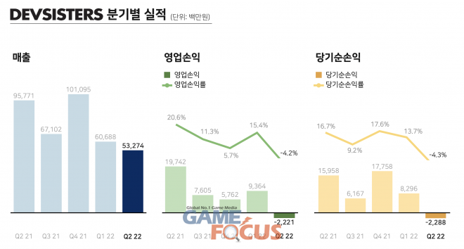 2분기 기준으로는 매출액 533억원, 영업손실 22억원, 당기순손실 23억원을 기록했다. 매출액의 경우 출시 1주년을 넘긴 쿠키런: 킹덤의 매출이 하향 안정화됨에 따라 전 분기 대비 12.2% 감소했고, 영업손익은 기존 및 신규 개발 프로젝트 확대에 따른 인건비와 인력 투자에 따른 전반적인 비용 증가, 해외 공략을 위한 로컬라이징 비용 추가 등의 영향으로 적자전환됐다.