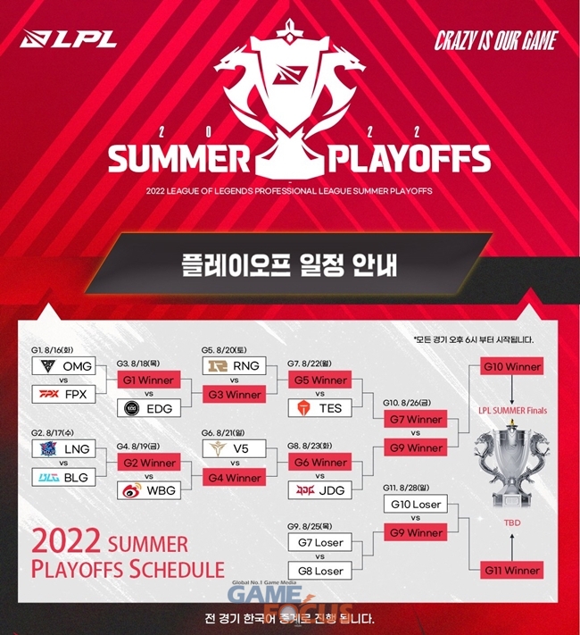 2022 LPL 서머 플레이오프 한국어 중계는 16일 저녁 6시 시즌 8위를 기록한 OMG(Oh My God)팀과 9위를 기록한 FPX(FPX Esports)팀의 경기로 시작된다. FPX에는 'Clid' 김태민 선수가 활약 중이다.