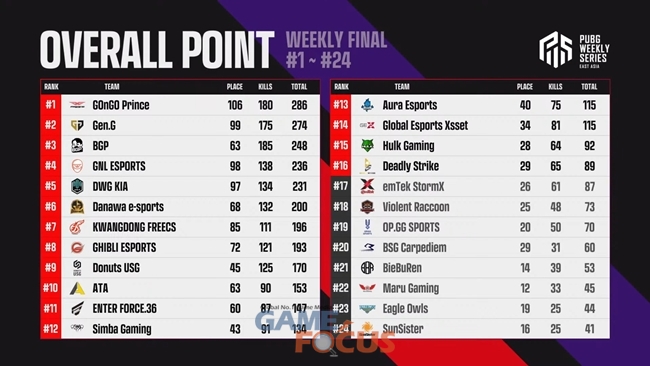 2위에 오른 Gen.G의 플레이도 돋보였다. 9매치까지 1위 GHIBLI ESPORTS와 24포인트로 우승과 거리가 있어 보였던 Gen.G는 마지막 10매치에서 다수의 킬 포인트를 획득해 25포인트를 추가하는 등 거세게 추격했지만, 단 1포인트 차이를 극복하지 못하고 아쉽게 우승을 놓쳤다. 3위에 오른 KWANGDONG FREECS, 4위 BGP도 위클리 파이널 기간 동안 좋은 경기력을 선보이며 순위권에 자리했다.
