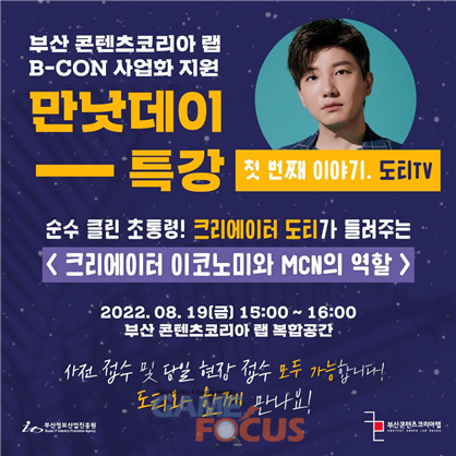 이번 특강의 첫 번째 강연자로는 ㈜샌드박스 네트워크의 공동 창립자이자 순수 클린 초통령 크리에이터로 유명한 '도티 TV'가 함께한다. '도티 TV'는 선한 영향력을 행사하며 새로운 디지털 놀이 문화를 선도하는 유튜브 크리에이터로서, 1인 크리에이터를 꿈꾸는 부산 지역의 창작자 및 예비 창작자들에게 노하우를 전수할 예정이다.