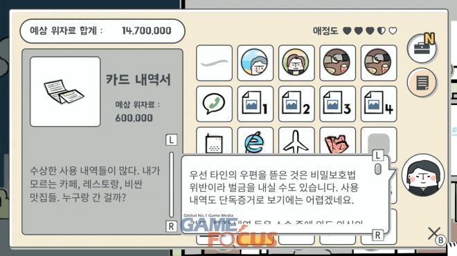 플레이어는 집, 그리고 집 밖 곳곳에서 불륜 증거를 찾을 수 있으며 획득한 증거를 변호사에게 이혼 소송에 대한 상담을 받아 볼 수 있다. 또한, 배우자에게 들키지 않게 짧은 시간 안에 컴퓨터 비밀번호를 풀거나, 배우자가 자는 동안 숨죽이고 조용히 핸드폰을 확인하는 등 다양한 미니게임을 통해서도 증거를 수집할 수 있다.
