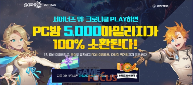 컴투스는 더 나아가 PC버전 유저들이 함께 할 수 있는 PC방 마일리지 이벤트를 마련하고, 풍성한 혜택을 제공한다. 이벤트는 크로스플레이 전용 PC 리워드 플랫폼인 크래프트박스가 설치된 전국 5,500개 PC방 중 피카마일리지를 가맹한 PC방에서 참여하거나, 개인 PC로 크래프트박스를 설치해 즐길 수 있다. 이벤트에 참여해 ‘크로니클’을 30분 이상 플레이하면 PC방 요금, 먹거리 이용권 또는 문화상품권으로 교환해 사용할 수 있는 5,000미션 마일리지가 제공된다. 매일 출석 미션을 달성하면 추가 마일리지도 주어진다.