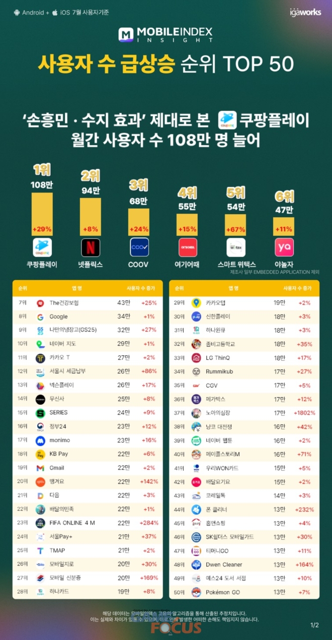 '쿠팡플레이', 7월에 사용자 수 108만 증가하며 사용자 수 급상승 순위 1위
