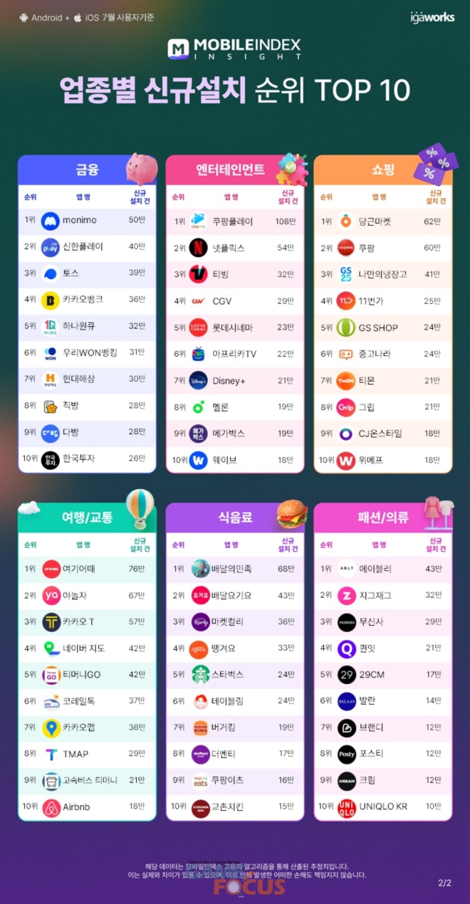 업종별 신규설치 순위에서는, 금융-monimo(50만 2174건), 엔터테인먼트-쿠팡플레이(108만 4766건), 쇼핑-당근마켓(61만 5380건), 여행/교통-여기어때(75만 8839건), 식음료-배달의민족(67만 6557건), 패션/의류-에이블리(43만 3334건)가 각 카테고리별 1위에 올랐다.