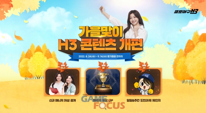 엔씨소프트(대표 김택진, 이하 엔씨(NC))가 자사의 모바일 야구 매니지먼트 게임 ‘프로야구 H3’에서 가을 시즌을 맞이해 콘텐츠 개편 및 다양한 이벤트를 실시한다.