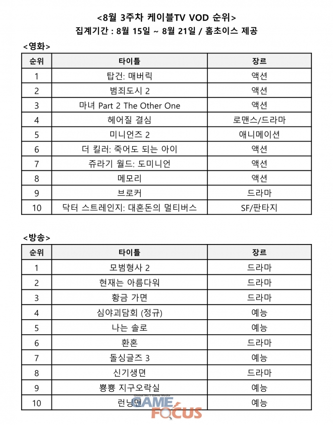 홈초이스는 24일 LG헬로비전, Btv 케이블, 딜라이브, CMB, HCN 등 전국 케이블TV ‘8월 3주차 영화 · 방송 VOD 순위’를 발표했다.
