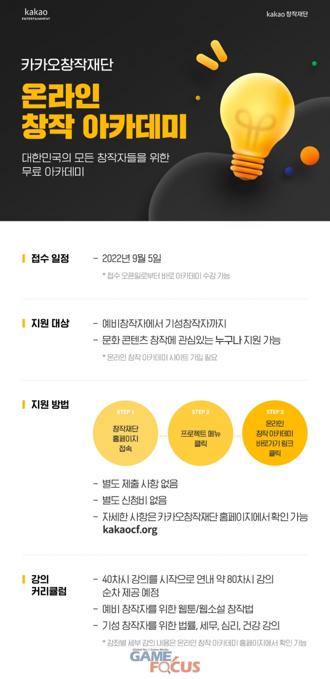 카카오창작재단, 오는 9월 5일 무료 '온라인 창작 아카데미' 오픈. 창작법, 법률, 세무, 심리 등 창작자에게 실질적으로 도움되는 강의 제공