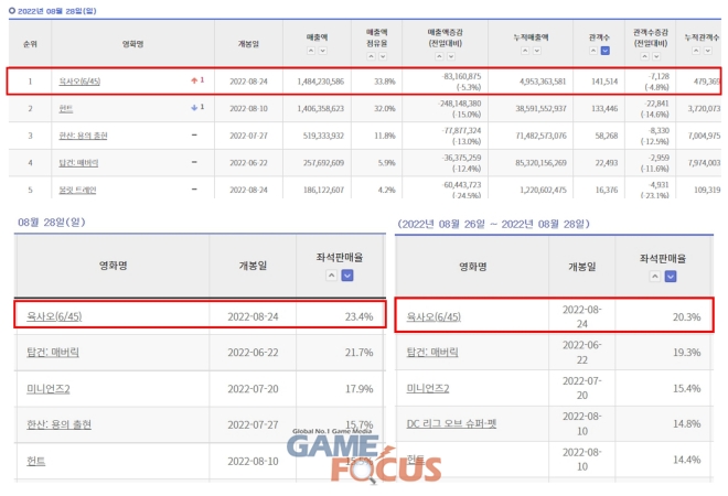 8월 29일 오전 12시 39분 기준으로 영화진흥위원회 통합전산망에 따르면 '육사오'는 8월 28일 전체 박스오피스 1위에 오르며 누적 관객 수 479,369명을 기록했다. 8월 24일 개봉일 동시기 개봉작 박스오피스 정상을 차지했던 '육사오'는 28일 전체 박스오피스 1위까지 등극하며 올여름 극장가 다크호스의 저력을 입증하고 있다.