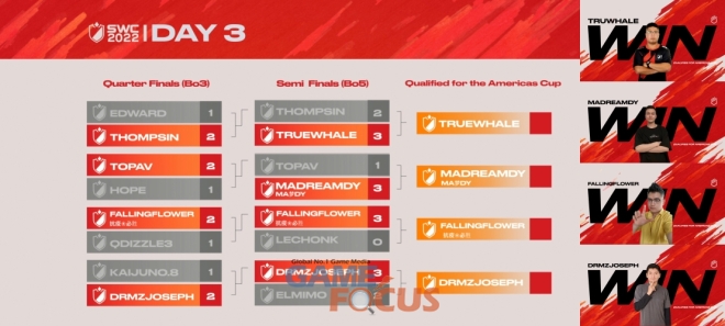 남은 기회를 두고 열두 선수들이 각축전을 벌인 끝에, 'SWC2021' 아메리카컵 공동 3위를 기록한 'TRUEWHALE'이 가장 먼저 본선행에 성공하고 지난해 월드파이널까지 진출한 'MADREAMDY'와 신인 'FALLINGFLOWER'가 그 뒤를 이었다. 올해 데뷔전을 치르는 'ELMIMO'와 'SWC2018' 아메리카컵 우승자 'DRMZJOSEPH' 선수가 승부를 겨뤘으며, 'DRMZJOSEPH'이 세 개 매치를 먼저 승리하면서 본선 진출을 확정했다.