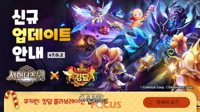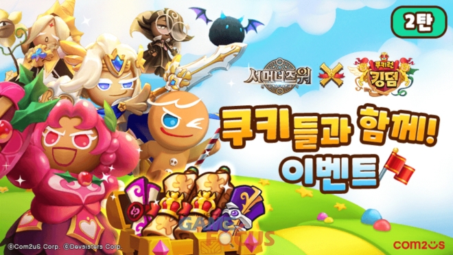 컴투스의 글로벌 히트작 '서머너즈 워'는 데브시스터즈 '쿠키런: 킹덤'과의 컬래버레이션을 앞두고 다양한 티저 이미지와 영상을 통해 두 IP(지적재산권)의 만남을 알렸다. 전 세계 1억 6000만 다운로드를 달성하며 8주년인 현재까지 장기 흥행 중인 '서머너즈 워'와 글로벌 누적 매출 3,000억원 및 누적 이용자수 4,000만명을 넘어선 '쿠키런: 킹덤'의 협업은 컴투스와 데브시스터즈 양 사 간판 IP의 만남으로 더욱 특별한 시너지가 기대된다.