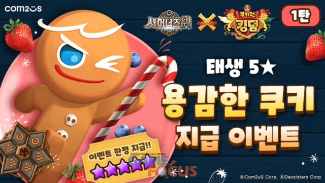 컴투스는 이번 협업 콘텐츠를 더욱 재미있게 즐길 수 있도록 이벤트도 개최한다. '태생 5★ 용감한 쿠키 지급 이벤트' 참여 시 게임 플레이를 통해 쌓은 포인트로 5성 풍 속성 용감한 쿠키를 획득할 수 있으며, 사전 이벤트·출석·콘텐츠 플레이 등으로 모은 젤리빈을 쿠키들에게 선물하면 쿠키런: 킹덤 소환서 2장을 비롯한 풍성한 선물을 지급하는 '쿠키들과 함께!' 이벤트도 진행된다.