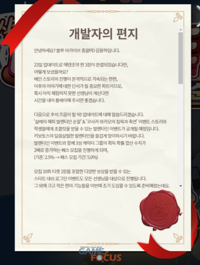 '블루 아카이브' 개발을 총괄하는 김용하 EPD는 "이번 해피 발렌타인 이벤트 사전등록과 업데이트 로드맵 공개를 좋게 봐주셔서 감사드린다"며 "앞으로도 유저분들 말씀에 귀 기울이며 '블루 아카이브'를 만들어가겠다"고 밝혔다.