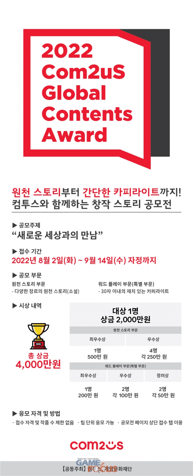'컴투스 글로벌 콘텐츠문학상'은 미래의 콘텐츠 시장을 이끌어갈 창작 인재 발굴과 지원을 위해 마련된 공모전으로 올해로 개최 5주년을 맞이했다. 올해는 특히 블록체인 및 메타버스 등의 신사업 추진을 통해 미래 디지털 패러다임을 선도하고 있는 컴투스의 비전을 담아 '새로운 세상과의 만남'이라는 주제로 오는 9월 14일까지 작품을 접수하고 있다. 기존 '원천 스토리' 부문에 간단한 카피라이트 문구만으로 참여 가능한 '워드 플레이' 특별 부문을 신설해, MZ 세대를 비롯한 많은 창작자들로부터 주목받고 있다.