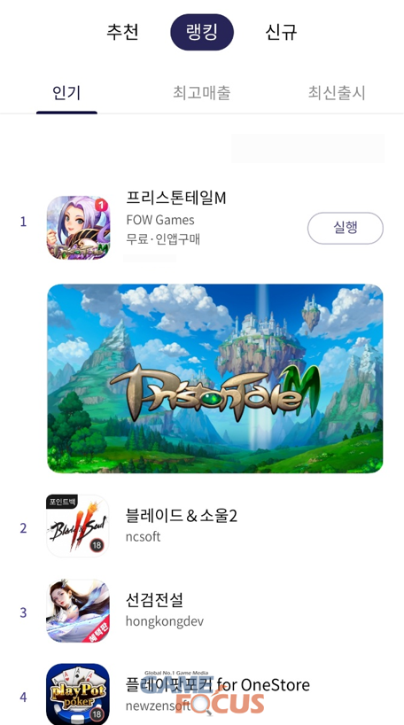 파우게임즈(FOW GAMES, 대표 이광재)는 5일, 자사가 서비스하는 신작 모바일 MMORPG ‘프리스톤테일M’이 구글 플레이와 원스토어에서 인기 순위 1위를 달성하고 애플 앱스토어의 게임 인기 순위 3위에 오르며 상위권을 기록하고 있다고밝혔다.