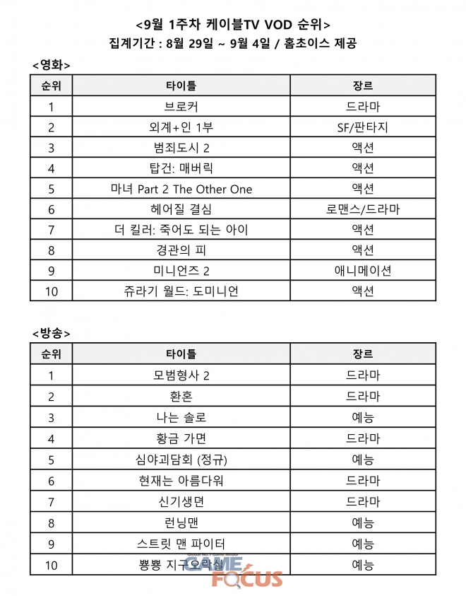 (주)홈초이스는 7일 LG헬로비전, Btv 케이블, 딜라이브, CMB, HCN 등 전국 케이블TV '9월 1주차 영화 · 방송 VOD 순위'를 발표했다.