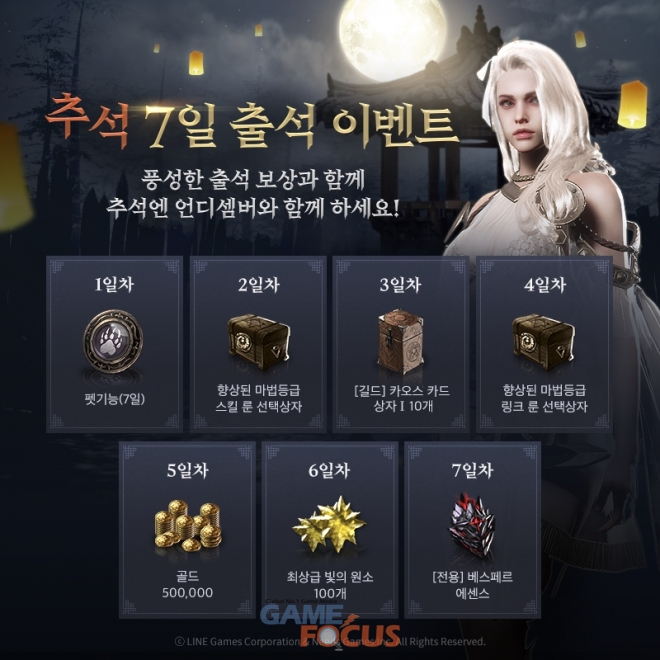 한편 '언디셈버'는 추석을 맞아 9월 15일까지 다양한 이벤트를 진행한다. 먼저 이 기간 중 접속일에 따라 '베스페르 에센스'와 '합성 전용 룬' 등을 제공하는 출석 이벤트가 실시된다. 또한 '윷놀이 방식'의 이벤트에 참여하면 '전설 상승 에센스 조각' 및 '부적 전설 상승 에센스' 등 높은 가치의 아이템을 다양하게 획득할 수 있다.