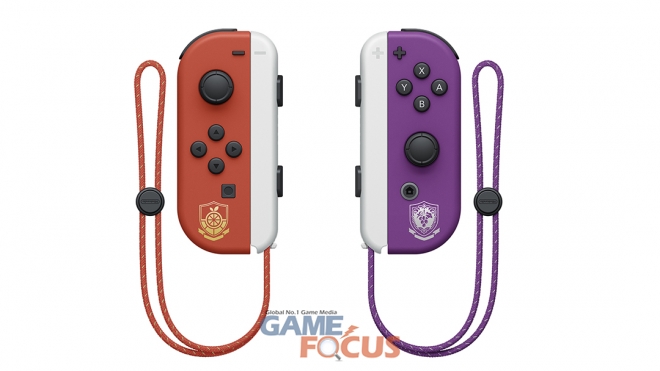 '포켓몬스터스칼렛・바이올렛'의 메인 컬러에 맞춘 특별한 컬러의 Joy-Con에는 게임에 등장하는 '오렌지 아카데미'와 '그레이프 아카데미' 각각의 문장이 디자인되어 있다.