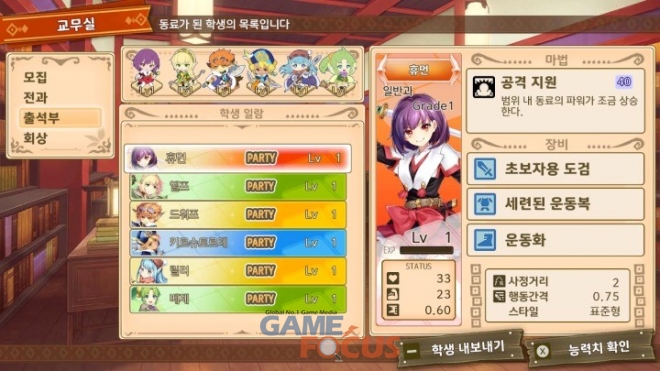 플레이어는 10종의 다양한 종족(휴먼/엘프/드워프/클라즈/펠퍼/노움/페어리 등)으로 파티를 구성하고 학생들을 직접 배치하여 자신의 의지에 따라 움직이면서 전투에 임하게 만들 수 있다. 플레이어의 전략에 의해 승패가 결정되기 때문에 자신만의 전략을 세워 승리를 쟁취해야만 한다.