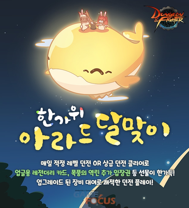 먼저, ‘던전앤파이터’는 9월 28일까지 게임 접속 시 ‘한가위 맞이 THING’S GIFT’로 직업 및 무기 타입 선택이 가능한 ‘12강화 8재련 근원의 무기’를 제공한다. 또, 9월 15일까지 ‘한가위 아라드 달맞이’ 이벤트에 참여해 일일 미션과 누적 미션을 완료하면 골든 베릴, 폭풍의 역린 추가 입장권, 에픽 장비 풀세트 등의 보상을 지급하며, 원활한 게임 플레이를 지원하고자 최대 105레벨까지 성장하는 특별 성장형 장비 대여 이벤트를 실시한다.