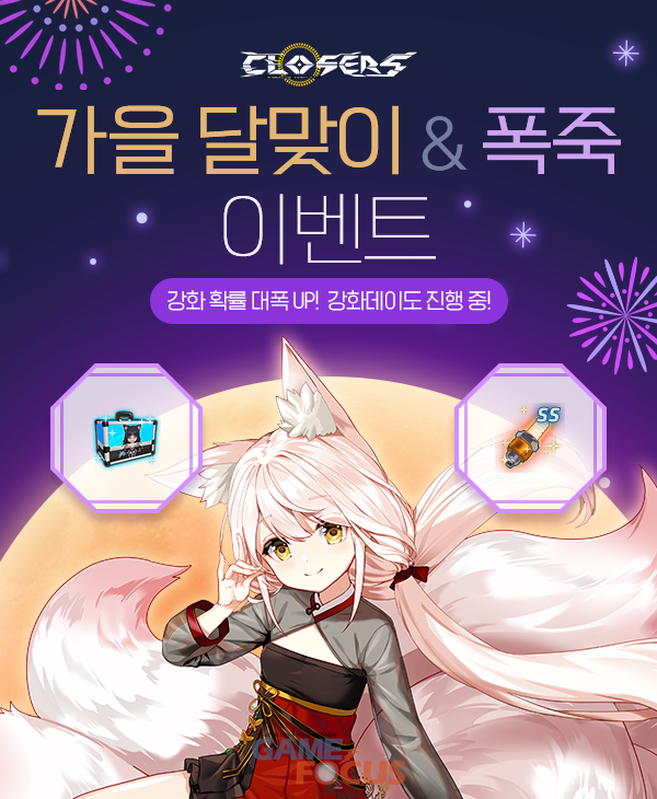 ‘클로저스’는 10월 6일까지 매일 접속만 해도 회복 아이템 ‘스페셜 송편’을 제공하며 ‘S 확정 D 컴포넌트 : 기어’, 이벤트 코스튬, 각종 필수 보상으로 교환할 수 있는 ‘토끼 코인’을 제공한다. 같은 기간 피로도 10 이상 소모 던전 클리어로 획득 가능한 ‘가을 축제 증서’를 모으면 최신 엘리트 펫인 ‘미니 바스테트 펫 성체 보관함’ 등을 제작할 수 있으며, 9월 22일까지는 14~25단계의 강화 성공 확률을 최대 50%까지 높여주는 강화 이벤트도 진행한다.