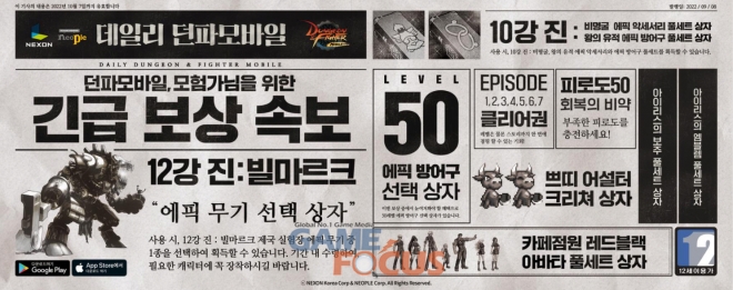 한편, ‘던파모바일’은 서울 주요 지역에 ‘데일리 던파모바일’이란 이름으로 신문지 콘셉트의 지하철 옥외광고를 선보여 이목을 집중시켰다. ‘프리스트(남)’ 업데이트 및 이후 진행될 최고 레벨 확장 등을 기념해 유저라면 한 눈에 알아차릴 수 있는 다양한 보상을 텍스트 형태로 강조했다. ‘던파모바일, 모험가님을 위한 긴급 보상 속보’라는 헤드라인을 통해 시선을 집중시켰으며, 가장 핵심이 되는 ‘12강 진: 빌마르크 에픽 무기 선택상자’를 중심에 배치해 보상의 기대감을 높였다.
