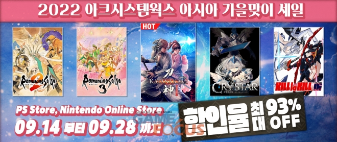 이번 세일은 각 다운로드 스토어(PlayStation™Store, 닌텐도 온라인 스토어)에서 진행되며, 특히 이번 세일에서는 '사무라이의 길 외전 KATANAKAMI'의 30% 할인을 포함하여, '로맨싱 사가 2'와 '로맨싱 사가 3'를 30% 할인가로 구매할 수 있다. 그 밖에도 '킬라킬 더 게임 -IF-', 'CRYSTAR -크라이스타-', '리듬 피트니스 HOME FiT' 등 인기 타이틀을 저렴한 가격으로 만나볼 수 있다.