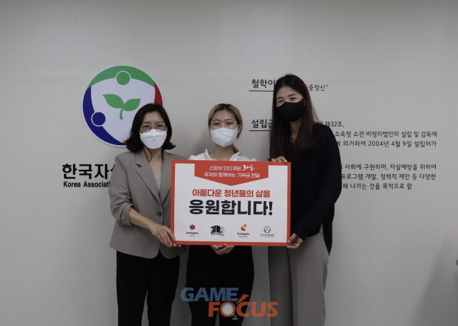 희망스튜디오는 지난 16일(금) 한국자살예방협회에서 기부금 전달식을 가졌다. 이 날 기부금 전달식에는 한국자살예방협회 박진 사무국장을 비롯해 ‘30일 어나더’ 개발사 더브릭스 이혜린 대표, 스토브인디 정유진 팀장 등이 참석했다.