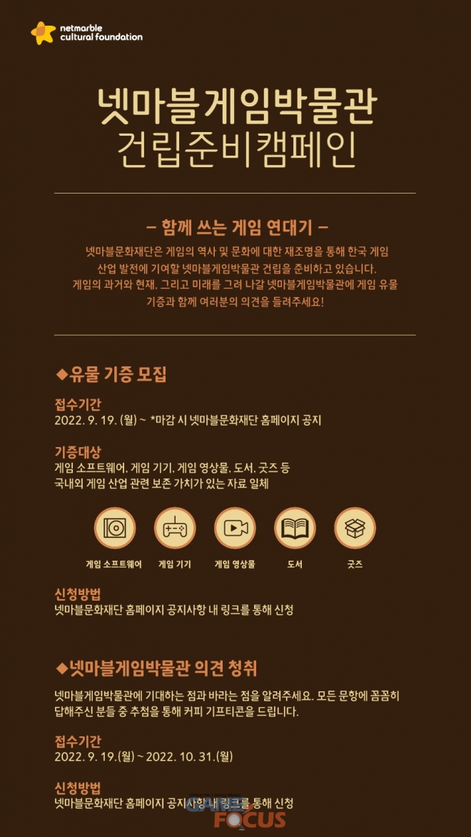 넷마블문화재단은 넷마블게임박물관에 대한 사전 의견을 청취하고 반영하기 위해 오는 10월 31일까지 설문조사를 실시한다. 넷마블문화재단 홈페이지에서 참여 가능하며, 참여자 중 추첨을 통해 커피 기프티콘을 제공한다.