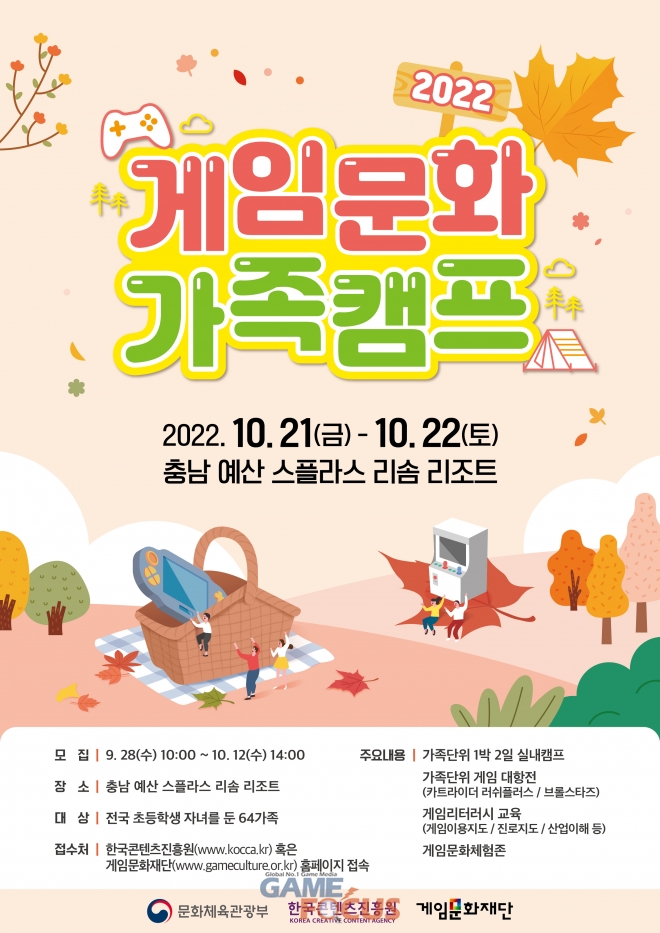 문화체육관광부, 한국콘텐츠진흥원, 게임문화재단은 10월 21일(금)부터 22일(토)까지 1박 2일간 예산 스플라스 리조트에서 4회차 '2022 게임문화 가족캠프(이하 캠프)'를 운영한다고 밝혔다. 캠프는 초등학생 자녀를 둔 가족은 누구나 신청할 수 있다.