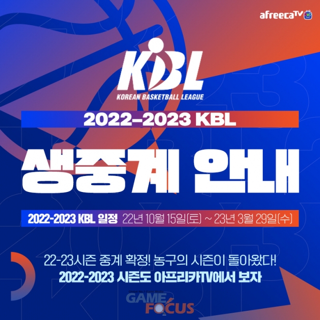 아프리카TV는 오는 10월 1일(토) 열리는 ‘2022 KBL 컵대회’를 시작으로 ’2022-2023시즌 KBL 정규리그’ 전경기를 생중계한다고 밝혔다. 정규리그는 오는 10월 15일(토) 개막전을 시작으로, 2023년 3월 29일(수)까지 6개월간의 대장정에 돌입한다. 평일 경기는 저녁 7시, 주말·공휴일은 오후 2시와 4시에 열린다.
