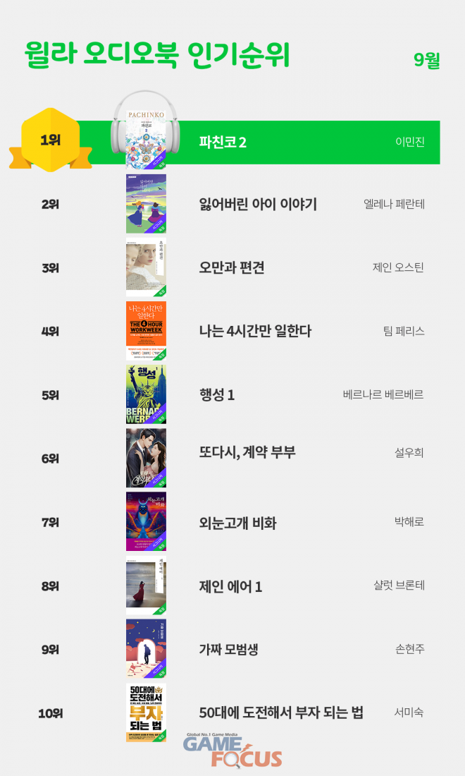 윌라 오디오북에서 9월 가장 많이 재생된 작품은 이민진 작가의 '파친코' 2권이다. 지난 8월 도서에 이어 발빠르게 오디오북으로 연재된 '파친코'는 지난 9월 28일 대장정의 마침표를 찍었다. 원작의 톤 앤 매너를 오디오북으로 잘 살려냈다는 평과 함께 캐릭터가 그대로 살아 숨 쉬는 것 같은 생동감과 몰입감을 선사했다.