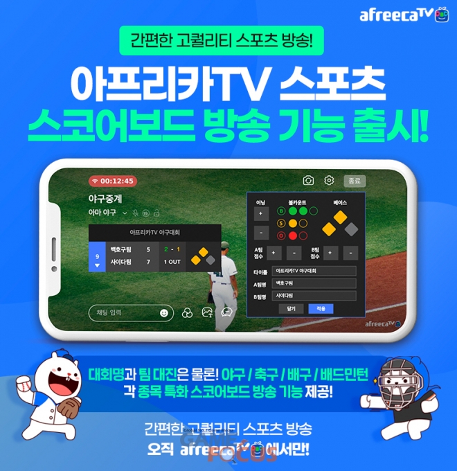 특히 다양한 정보가 필요한 야구 종목에서 '스코어보드' 기능을 활성화하면 BJ는 터치 한 번으로 방송 화면에 대회명, 팀 대진, 볼, 아웃 카운트, 주자 정보, 점수, 이닝 등 다양한 경기 관련 정보를 표기하는 것이 가능하다. 예를 들어 대회 타이틀과 팀 명을 입력하고, 터치를 통해 볼, 아웃 카운트와 1·2·3루에 나가 있는 주자를 설정할 수 있다. 또한, 각 이닝 종료 후 플러스(+) 버튼을 누르게 되면 볼, 아웃 카운트와 주자 설정이 자동으로 리셋되는 기능을 추가해 사용자의 편의성을 더했다.