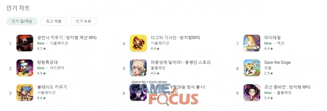 광전사 키우기는 10월 2주 차의 첫 시작일인 10월 3일을 기점으로 구글 플레이스토어 인기 1위 랭크에 달성된 이래 10월 6일까지 이를 유지했다.