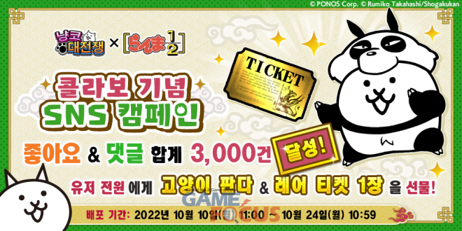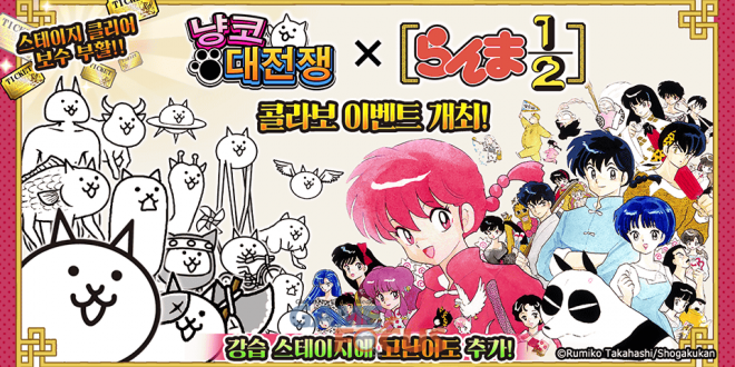 주식회사 포노스(대표: 츠지코 요리카츠)는 병맛&귀염 타워디펜스 게임을 대표하는 <냥코대전쟁>에서 주식회사 쇼가쿠칸이 발행하는 타카하시 루미코작 인기 만화 ’란마 1/2’과의 콜라보레이션 이벤트를 2022년 10월 10일 11시부터 개최한다고 밝혔다.
