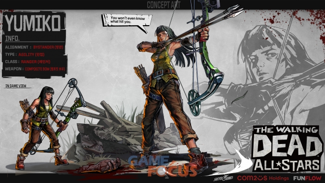 이번 업데이트를 통해 신규 에픽 등급 캐릭터, '유미코'가 등장했다. 유미코는 '워킹데드' 코믹스 원작에도 등장하는 캐릭터로서, '워킹데드: 올스타즈'에서는 활을 주무기로 활용하는 방관 성향의 레인저다. 강력한 화살 3발을 3회 발사하는 필살기가 있어서 원거리와 근거리 공격에 모두 유용하다. 기본적인 관통 공격을 비롯해 독 묻은 화살 공격, 가장 허약한 상대에게 큰 피해를 주는 매복 암살 등 다양한 공격 기능을 갖췄다.