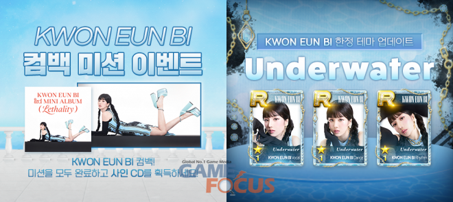 먼저 컴백 업데이트와 함께 공개되는 신곡 ‘Underwater'은 사랑하는 상대를 소유하여 영원히 함께 하고픈 짙고 강렬한 욕망을 심해 깊은 바다 및 ‘Underwater'로 표현한 가사가 인상적인 곡으로 한정 테마 컨셉 디지털 카드는 권은비의 다채로운 매력 중에서도 신비롭고 몽환적인 컨셉을 담아 유저 및 팬들의 소장 욕구를 자극할 예정이다.