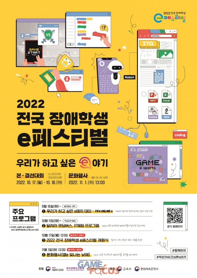 문화체육관광부(장관 박보균)와 한국콘텐츠진흥원(원장 조현래, 이하 콘진원)이 국립특수교육원, 넷마블문화재단과 공동으로 게임과 e스포츠를 통한 장애학생들의 건강한 여가 문화 확산을 위한 '2022 전국 장애학생 e페스티벌'을 오는 17일과 18일 양일간 개최한다.