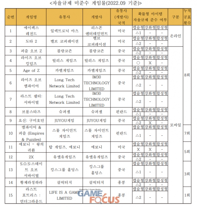 이에 따라 GSOK 내(內) 자율규제평가위원회(위원장 황성기)는 2022년 9월 기준으로 총 15종(온라인 2종, 모바일 13종)의 자율규제 미준수 게임물을 공개한다고 밝혔다.