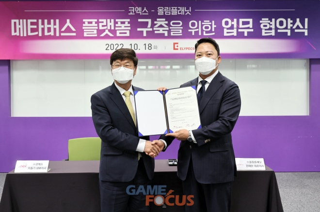 올림플래닛(대표 권재현)이 대한민국의 마이스(MICE) 산업을 리드하고 있는 코엑스(사장 이동기)와 18일 오전 코엑스 프라이드랩에서 엘리펙스 메타버스 업무 협약을 체결했다고 밝혔다.