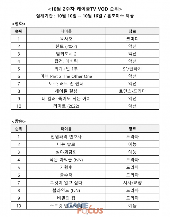 (주)홈초이스(총괄 전윤수)는 20일 LG헬로비전, SKB, 딜라이브, CMB, HCN 등 전국 14개 채널의 케이블TV '10월 2주차 영화 · 방송 VOD 순위'를 발표했다.