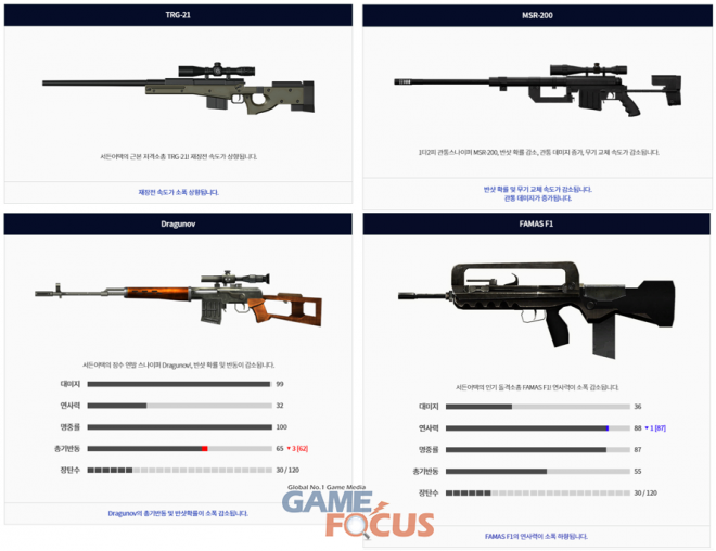 이용자 피드백을 반영해 기존 무기들의 밸런스를 조정했다. 오랜 기간 개편 대상에서 제외됐던 '서든어택'의 인기 저격소총 'TRG-21'의 재장전 속도가 소폭 상향됐으며, 'MSR-200'의 반샷 확률 및 무기 교체 속도가 감소됐고, 관통 대미지는 증가했다. 이 외 'Dragunov'의 총기반동 및 반샷 확률도 소폭 상향됐다. 반면, 서든러 사이에서 불만이 높았던 'FAMAS F1'의 연사력을 소폭 하향하여 타 돌격 소총과의 밸런스를 맞췄다. 이와 함께 저배율 스코프 기능을 탑재하여 지나친 원거리 저격 플레이를 견제할 수 있는 연사 권총 'VS-9'을 신규 보조무기로 추가했다.
