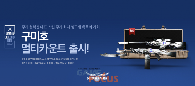 한편, 넥슨은 '구미호' 스킨 무기를 출시하고 11월 3일까지 관련 이벤트를 실시한다. 무기 획득 기간을 누적으로 300일 수집 시 '구미호' 무기 영구제 선택권을, 600일 수집 시 '[M] Double 무기 영구제 선택권6(마이건2)'와 더불어 2,000SP를 선물한다.