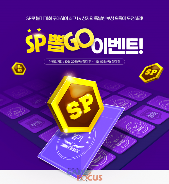 11월 3일까지 게임 플레이, 적 처치 등을 달성하면 총 49만 경험치와 더불어 신규 무기인 'VS-9(7일)과 '패스 티켓', 'MSR-200(7일)' 등을 획득할 수 있다. 같은 기간, 'SP 뽑GO 이벤트'를 실시해 게임에 60분 접속하면 뽑기 기회 1회를 지급하며, PC방에서 접속 시 추가로 2회를 제공한다. 해당 이벤트를 통해 'G18(S) 블랙캐슬(50일)', 경험치 등과 더불어 각종 무기 및 캐릭터를 최대 영구제까지 획득할 수 있는 '호러 상자'를 지급한다.