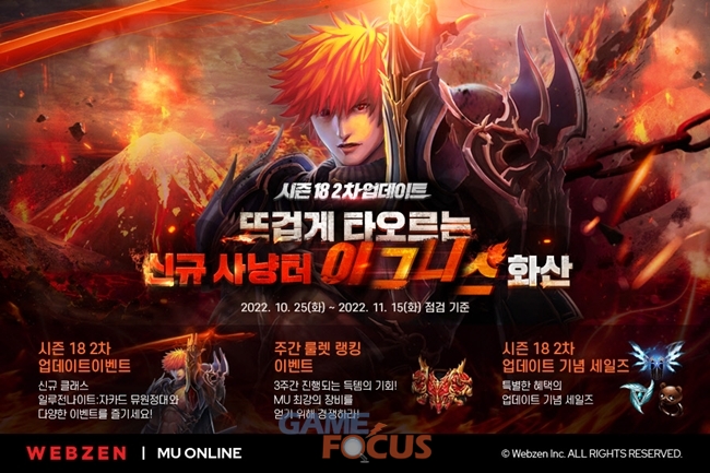 웹젠(대표 김태영)이 PC MMORPG '뮤 온라인'에 시즌18 2차 업데이트로 신규 지역 '이그니스 화산' 오픈과 함께 육성 최대 레벨을 확장했다.
