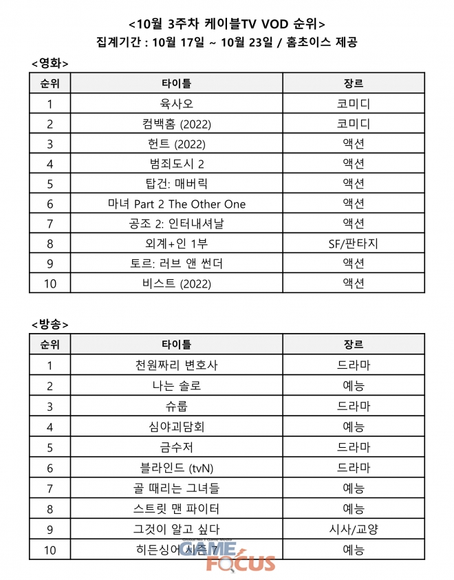 (주)홈초이스(총괄 전윤수)가 발표한 LG헬로비전, SKB, 딜라이브, CMB, HCN 등 전국 14개 채널의 케이블TV '10월 3주차 영화 · 방송 VOD 순위'에 따르면, 영화 '육사오'와 드라마 '천원짜리 변호사'가 이번 주 또 다시 각각 영화 및 방송 VOD 1위를 기록했다.