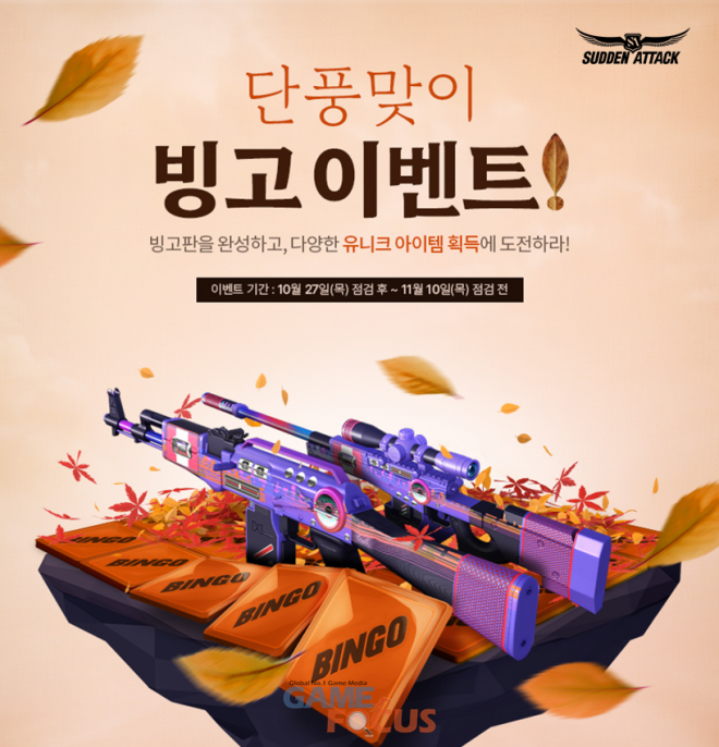 11월 10일까지 ‘단풍 맞이 빙고 이벤트’도 진행한다. 게임 접속, 플레이, 승리, 적 처치 등 미션을 달성하고 얻은 ‘빙고 티켓’을 활용해 빙고 줄을 완성하면 ‘윈체스터(IS) BOOM(15일)’, ‘HipHop A 세트(15일)’ 등을 획득할 수 있다. 빙고를 전체 3단계까지 완성하면 총 60만 경험치와 더불어 ‘영구제 밀봉’, ‘TRG21(IS) BOOM(영구제)’ 등 다양한 보상을 얻을 수 있다.