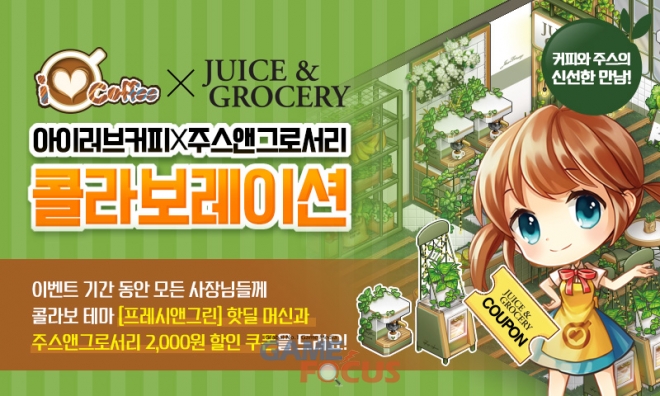 '아이러브커피' x '주스앤그로서리' 콜라보는 금일부터 오는 23일까지 진행된다. 먼저 '아이러브커피'는 콜라보의 일환으로 건강, 비건, 헬시를 콘셉트로 신규 콘텐츠를 다양하게 선보였다. 테마명 '프레시앤그린'으로 신규 꾸미기 테마 아이템 10종, 프레시앤그린 아이템 3종, 프레시앤그린 전용 머신 2종(커피 머신, 만능 쿠킹 머신) 등을 업데이트하고, 콜라보 스페셜 메뉴로 굿바이 나트륨 음료와 샐러드 스틱 사이드 메뉴를 추가했다.