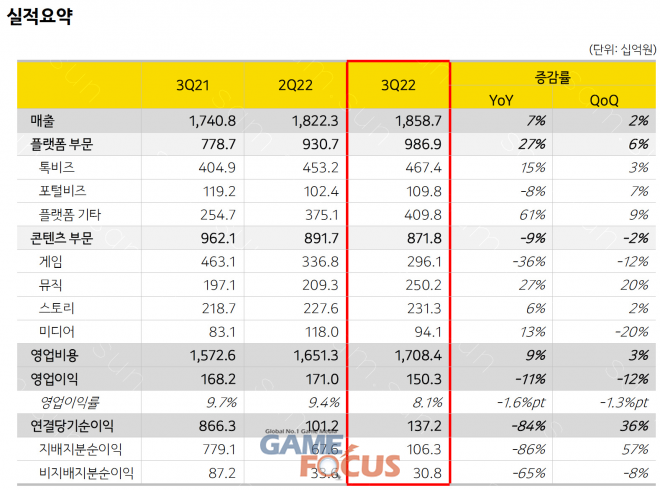 카카오의 2022년 3분기 플랫폼 부문 매출은 전 분기 대비 6%, 전년 동기 대비 27% 증가한 9,869억 원으로 집계됐다.
