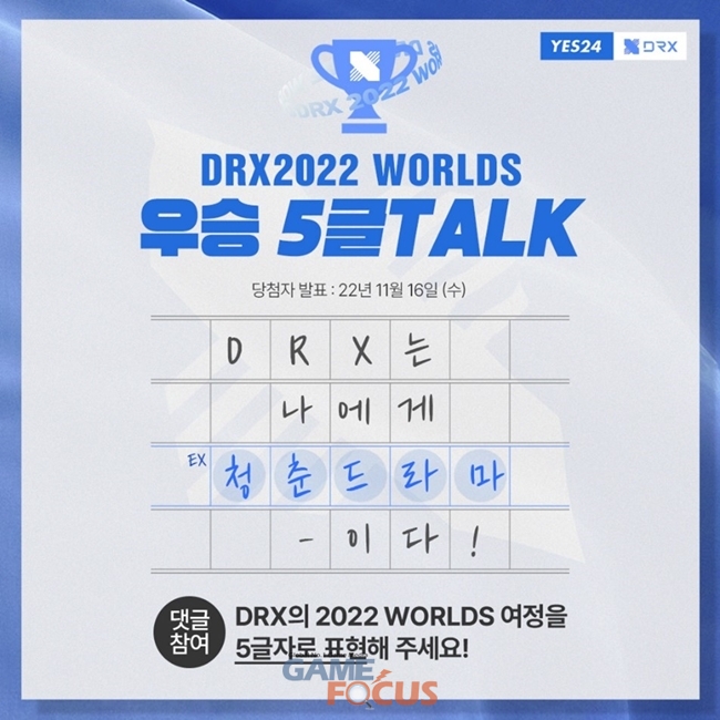 이스포츠 전문기업 DRX가 예스24와 '리그 오브 레전드'(LoL) 이스포츠팀 DRX의 '2022 리그 오브 레전드 월드 챔피언십' 우승을 기념해 'DRX 2022 Worlds 우승 5글 Talk!' 이벤트를 11일까지 진행한다.